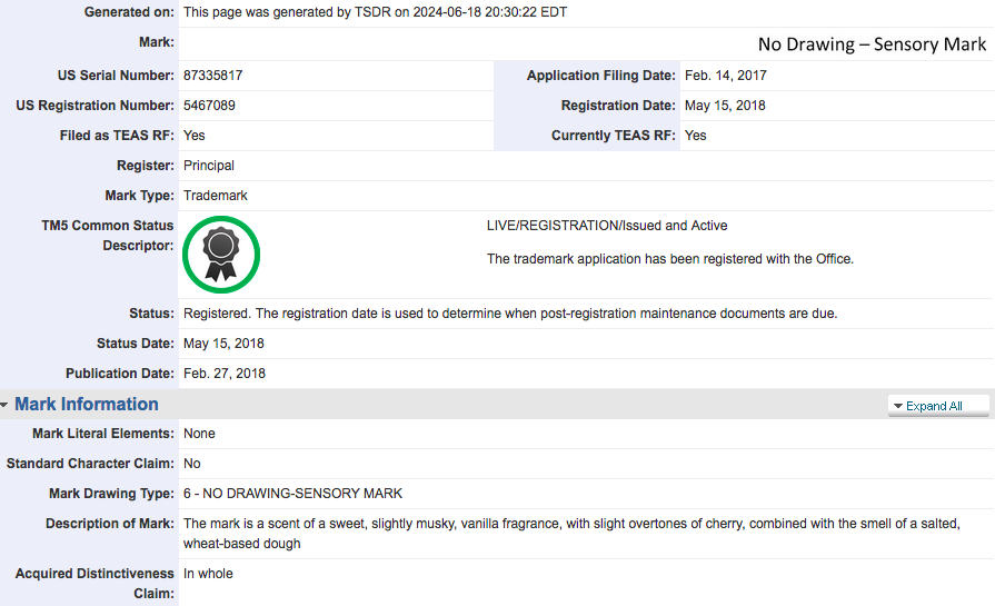2015年歐盟將圖文形式呈現的標準放寬到以一般技術呈現。由于氣味很難以圖形或文字描述,且必須能夠無歧義地被感知,這是一項挑戰。歐盟還沒有氣味商標被核準。