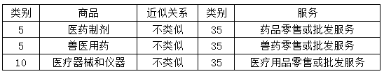 其次,在中國已經接受的3509類似群的藥品、醫療用品零售或批發服務,在與其他商品或服務的類似性判斷時,根據《類似商品和服務區分表》的規定,其僅與歸屬于本類似群的服務構成相同類似服務,與該零售或批發服務所涉及的具體商品并不發生交叉檢索【4】。舉例如下: