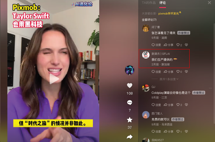 本案中,系爭(zhēng)商標(biāo)被系爭(zhēng)商標(biāo)申請(qǐng)人申請(qǐng)?jiān)诘?1類商品上,同時(shí)系爭(zhēng)商標(biāo)申請(qǐng)人同時(shí)也生產(chǎn)發(fā)光手環(huán)商品,與申請(qǐng)人處于同一商業(yè)領(lǐng)域。系爭(zhēng)商標(biāo)申請(qǐng)人僅申請(qǐng)了9枚商標(biāo),數(shù)量較少。在調(diào)查系爭(zhēng)商標(biāo)申請(qǐng)人行動(dòng)之時(shí),代理人發(fā)現(xiàn)系爭(zhēng)商標(biāo)申請(qǐng)人的關(guān)聯(lián)公司在抖音社交媒體關(guān)于國際巨星、歌手Taylor Swift(泰勒斯威夫特)的演唱會(huì)上使用申請(qǐng)人的PIXMOB發(fā)光手環(huán)的視頻下面(見下圖),主動(dòng)聲稱該手環(huán)為其公司生產(chǎn)制造。代理人立刻對(duì)該證據(jù)進(jìn)行了固定。