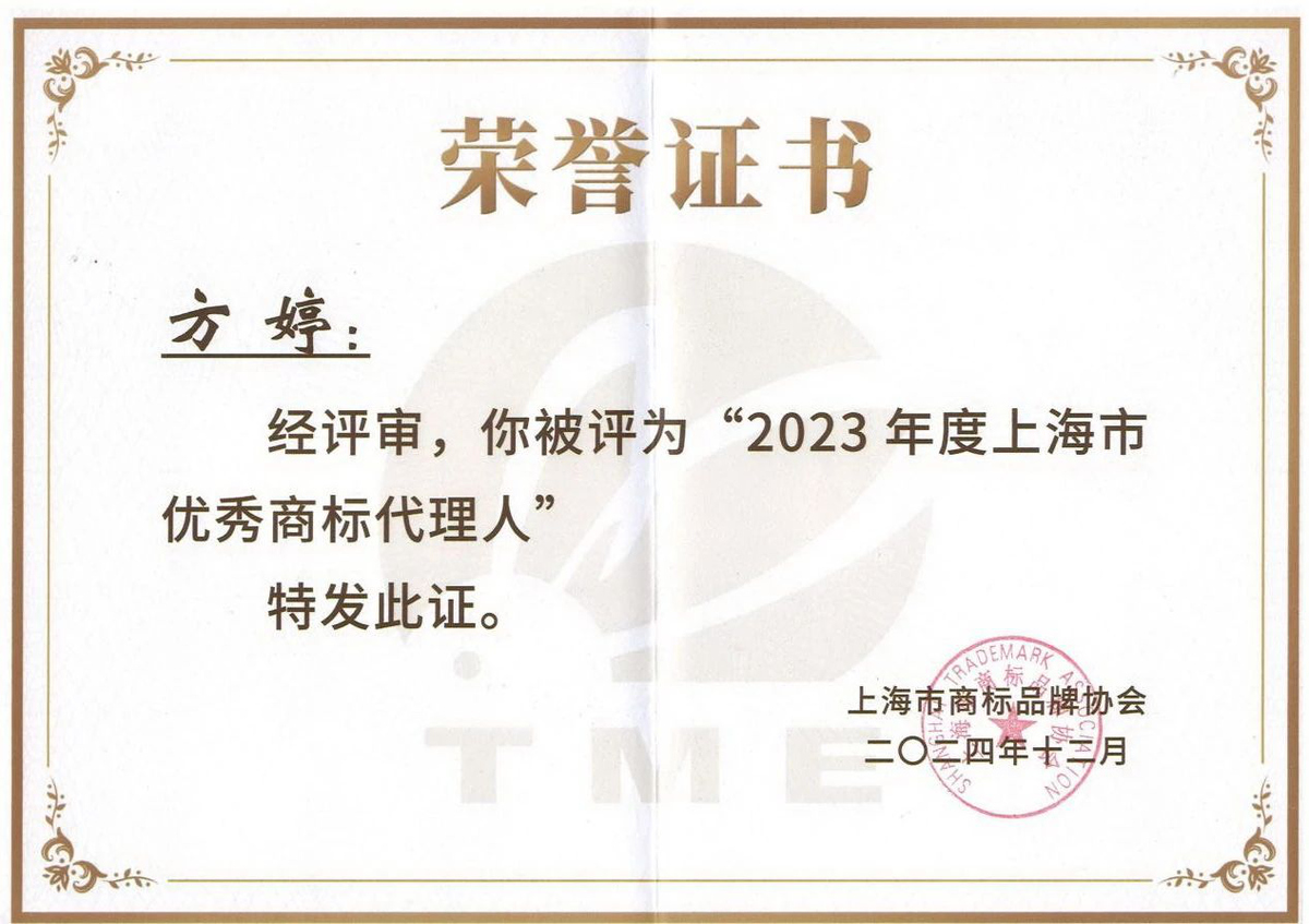 集佳上海分所方婷律師被評(píng)為2023年度“上海市優(yōu)秀商標(biāo)代理人”。