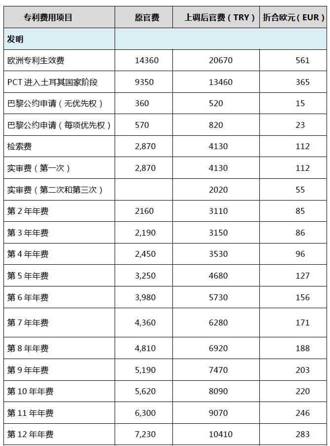 自2025年1月1日起,土耳其專利局適用新的官費標準。