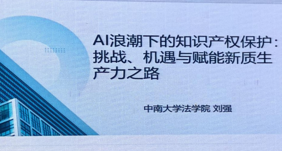 在專家培訓(xùn)環(huán)節(jié),中南大學(xué)法學(xué)院劉強(qiáng)教授帶來了一場精彩紛呈的專題分享。他以“AI浪潮下的知識產(chǎn)權(quán)保護(hù):挑戰(zhàn)、機(jī)遇與賦能新質(zhì)生產(chǎn)力之路”為題,深入剖析人工智能時代知識產(chǎn)權(quán)保護(hù)面臨的新課題,為與會者開拓了新視野,啟迪了新思路。