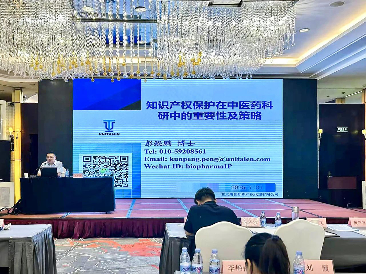 2025年7月31日,重慶市衛生健康委員會主辦的 “2025年全市中醫藥科技創新能力提升培訓班” 在重慶歐瑞大酒店舉行。集佳合伙人彭鯤鵬博士受邀主講 “知識產權保護在中醫藥科研中的重要性及策略”,為全市二級以上公立中醫醫療機構分管領導、科研負責人及巴渝岐黃學者等帶來專業解讀,助力中醫藥科研成果轉化與權益保護。